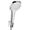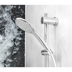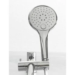 Die Brausegarnitur Kjos von Camargue besteht aus der Handbrause, einer Brausestange und einem Schlauch (150 cm). Die Handbrause bietet drei Strahlarten, zwischen denen man einfach per Knopfdruck wechseln kann. Das Easy Clean System verhindert nachhaltig Kalkablagerungen an den Düsen. Die Wandhalter der Brausestange aus rostfreiem Edelstahl sind flexibel einstellbar, so dass bestehende Bohrlöcher genutzt werden können. Die Anbringung kann per Bohren mit dem im Lieferumfang enthaltenen Montagematerial erfolgen oder per Kleben mit dem ebenfalls enthaltenen Adapter. Dazu ist das Nie wieder bohren Befestigungskit BK20 (nicht im Lieferumfang enthalten) erforderlich. Alle Anschlüsse sind auf ½“ genormt und können somit mit allen anderen Camargue Produkten, wie zum Beispiel Armaturen, Steigrohren oder Kopfbrausen kombiniert werden. Durch den verstellbaren Konusgleiter kann sowohl die Höhe der Handbrause, als auch ihre Neigung den eigenen Bedürfnissen angepasst werden. Der Brauseschlauch ist aus PVC gefertigt und besitzt eine Anti-Twist-Eigenschaft, welche lästiges Verdrehen des Schlauchs verhindert. Alle Bestandteile der Garnitur, die mit Wasser in Verbindung kommen, sind KTW/W270 zertifiziert und erfüllen somit alle gültigen Trinkwassernormen.