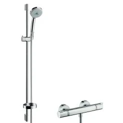 Das Brause-Set von Hansgrohe enthält eine Handbrause der Reihe Croma 100 Multi sowie ein Ecostat Comfort-Thermostat, einen Brauseschlauch, eine Brausestange, eine Seifenschale und Wandhalter aus Kunststoff. Es überzeugt durch ein sehr elegantes und modernes Gesamtbild mit harmonisch aufeinander abgestimmten Elementen. Über die drehbare Strahlscheibe können drei verschiedene Strahlarten angewählt werden. Dank der Quick-Clean Funktion verschwinden lästige Kalkablagerungen im Handumdrehen: Rückstände können von den flexiblen Anti-Kalk-Noppen einfach abgerubbelt werden. Der höhenverstellbare Schieber ist schwenkbar sowie um 90° im Winkel verstellbar. Mit dem an der Handbrause integrierten Drehwirbel wird ein Verdrehen des Brauseschlauches verhindert, was für uneingeschränktes Duschvergnügen sorgt.