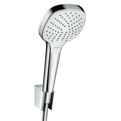 Das Brause-Set von Hansgrohe enthält eine Handbrause der Reihe Croma Select E Vario sowie einen Brauseschlauch und einen Wandhalter aus Kunststoff. Die innovative Select-Technologie ermöglicht ein bequemes Umschalten zwischen drei verschiedenen Strahlarten auf Knopfdruck. Die QuickClean-Funktion ermöglicht dank flexibler Silikonnoppen eine kinderleichte Entkalkung: Kalkablagerungen werden einfach abgerubbelt. Mit dem an der Handbrause integrierten Drehwirbel wird ein Verdrehen des Brauseschlauches verhindert, was für uneingeschränktes Duschvergnügen sorgt.