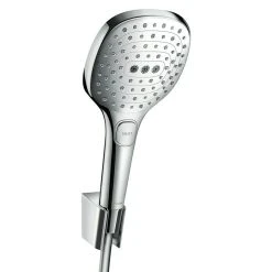 Das Brause-Set von Hansgrohe enthält eine Handbrause der Reihe Raindance Select E 120 sowie einen Brauseschlauch und einen Wandhalter aus Kunststoff. Es überzeugt durch sein modernes, geradliniges und elegantes Design. Die innovative Select-Technologie ermöglicht ein bequemes Umschalten zwischen drei verschiedenen Strahlarten auf Knopfdruck. AirPower senkt den Wasserbedarf, indem das Wasser mit Luft vermischt wird. So fühlt sich der Strahl zudem weicher, leichter und fülliger an. Mit der Quick-Clean Funktion verschwinden lästige Kalkablagerungen im Handumdrehen: Rückstände können von den flexiblen Anti-Kalk-Noppen einfach abgerubbelt werden. Darüber hinaus wird mit dem an der Handbrause integrierten Drehwirbel ein Verdrehen des Brauseschlauches verhindert, was für uneingeschränktes Duschvergnügen sorgt.