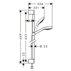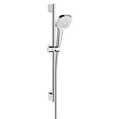 Die Brausegarnitur von Hansgrohe enthält eine Handbrause der Reihe Croma Select E Vario sowie einen Brauseschlauch, eine Brausestange und Wandhalter aus Kunststoff. Sie überzeugt durch ein sehr elegantes und modernes Gesamtbild mit harmonisch aufeinander abgestimmten Elementen in Chrom und Weiß. Die innovative Select-Technologie ermöglicht ein bequemes Umschalten zwischen drei verschiedenen Strahlarten auf Knopfdruck. Die QuickClean-Funktion ermöglicht dank flexibler Silikonnoppen eine kinderleichte Entkalkung: Kalkablagerungen werden einfach abgerubbelt. Der höhenverstellbare Schieber ist um 45° im Winkel verstellbar. Mit dem an der Handbrause integrierten Drehwirbel wird ein Verdrehen des Brauseschlauches verhindert, was für uneingeschränktes Duschvergnügen sorgt.