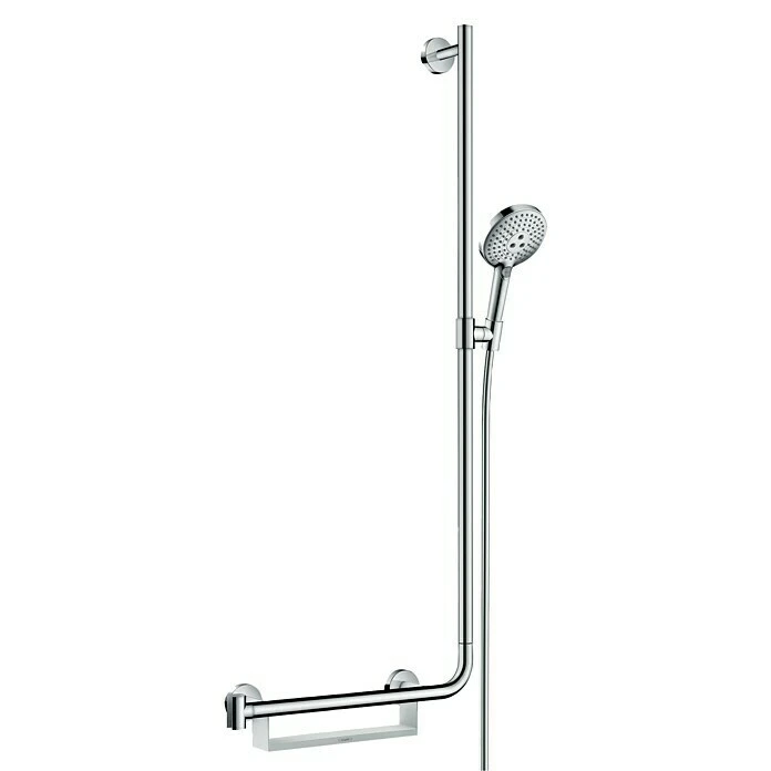 Die Brausegarnitur von Hansgrohe enthält eine Handbrause der Reihe Raindance Select S 120 sowie einen Brauseschlauch, eine Seifenschale und eine 110 cm lange Wandstange mit linksseitiger Haltegriff-Funktion. Das Konzept überzeugt dabei mit seiner Kombination aus sehr solider Bauweise und gleichzeitig überaus elegantem, geradlinigem Design. Die innovative Select-Technologie ermöglicht ein bequemes Umschalten zwischen drei verschiedenen Strahlarten auf Knopfdruck. AirPower senkt den Wasserbedarf, indem das Wasser mit Luft vermischt wird. So fühlt sich der Strahl zudem weicher, leichter und fülliger an. Dank der Quick-Clean Funktion verschwinden lästige Kalkablagerungen im Handumdrehen: Rückstände können von den flexiblen Anti-Kalk-Noppen einfach abgerubbelt werden. Der höhenverstellbare Schieber ist schwenkbar sowie um 90° im Winkel verstellbar. Mit dem an der Handbrause integrierten Drehwirbel wird ein Verdrehen des Brauseschlauches verhindert, was für uneingeschränktes Duschvergnügen sorgt. Die Sicherheit der Brausegarnitur ist durch TÜV SÜD geprüft.