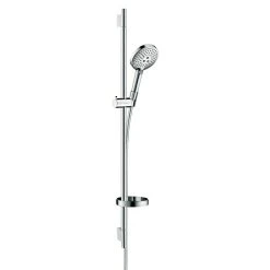 Die Brausegarnitur von Hansgrohe enthält eine Handbrause der Reihe Raindance Select S 120 sowie einen Brauseschlauch, eine Brausestange, eine Seifenschale und Wandhalter aus Kunststoff. Sie begeistert mit modernem, elegantem Design und harmonisch aufeinander abgestimmten Elementen. Die innovative Select-Technologie ermöglicht ein bequemes Umschalten zwischen drei verschiedenen Strahlarten auf Knopfdruck. AirPower senkt den Wasserbedarf, indem das Wasser mit Luft vermischt wird. So fühlt sich der Strahl zudem weicher, leichter und fülliger an. Dank der Quick-Clean Funktion verschwinden lästige Kalkablagerungen im Handumdrehen: Rückstände können von den flexiblen Anti-Kalk-Noppen einfach abgerubbelt werden. Der höhenverstellbare Schieber ist schwenkbar sowie um 90° im Winkel verstellbar. Mit dem an der Handbrause integrierten Drehwirbel wird ein Verdrehen des Brauseschlauches verhindert, was für uneingeschränktes Duschvergnügen sorgt.