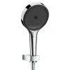 Das Brause-Set von Hansgrohe enthält eine Handbrause der Reihe Croma 100 Multi sowie einen Brauseschlauch und einen Wandhalter aus Kunststoff. Es überzeugt durch sein klares, modernes und elegantes Design. Über die drehbare Strahlscheibe können drei verschiedene Strahlarten angewählt werden. Mit der Quick-Clean Funktion verschwinden lästige Kalkablagerungen im Handumdrehen: Rückstände können von den flexiblen Anti-Kalk-Noppen einfach abgerubbelt werden. Darüber hinaus wird mit dem an der Handbrause integrierten Drehwirbel ein Verdrehen des Brauseschlauches verhindert, was für uneingeschränktes Duschvergnügen sorgt.