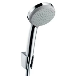 Das Brause-Set von Hansgrohe enthält eine Handbrause der Reihe Croma 100 Vario sowie einen Brauseschlauch und einen Wandhalter aus Kunststoff. Über die drehbare Strahlscheibe können vier verschiedene Strahlarten angewählt werden. Dank der Quick-Clean Funktion verschwinden lästige Kalkablagerungen im Handumdrehen: Rückstände können von den flexiblen Anti-Kalk-Noppen einfach abgerubbelt werden. Mit dem an der Handbrause integrierten Drehwirbel wird ein Verdrehen des Brauseschlauches verhindert, was für uneingeschränktes Duschvergnügen sorgt.
