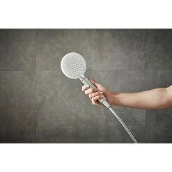 Die Hansgrohe Handbrause Crometta 100 Vario überzeugt in Funktion und Design. Die verchromte Handbrause liefert auf Wunsch vier verschiedene Strahlarten. Die Strahlarten lassen sich über eine drehbare Strahlscheibe umstellen. Mit der Quick-Clean Funktion verschwinden Rückstände im Handumdrehen. Lästige Kalkablagerungen werden aufgrund der integrierten Anti-Kalknoppen effektiv verhindert und durch Reiben der Noppen gelöst. Mit dem genormten ½“- Anschluss ist die Handbrause passgenau montierbar.