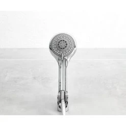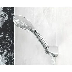 Das Brause-Set Cimbarra von Mixomat besteht aus einem flexiblen Brauseschlauch (150 cm), einer Handbrause und einer Wandhalterung. Die Handbrause bietet drei Strahlarten, zwischen denen man einfach per drehbarer Strahlscheibe wechseln kann. Das Easy-Clean-System verhindert nachhaltig Kalkablagerungen an den Düsen. Auf Grund ihrer ergonomischen Form liegt die Handbrause gut in der Hand. Der flexible Brauseschlauch aus PVC ist mit ½“ Anschlüssen versehen und passt auf jeden handelsüblichen Anschluss. Dank der Anti-Twist-Eigenschaft wird das lästige Verdrehen des Schlauchs verhindert. Der praktische Brausehalter dient dazu, die Handbrause bei Bedarf an der Wand zu fixieren. Alle Bestandteile des Sets, die mit Wasser in Verbindung kommen, sind KTW/W270 zertifiziert und erfüllen somit alle gültigen Trinkwassernormen.