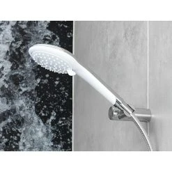 Das Brause-Set Langfoss von Mixomat besteht aus einem flexiblen Brauseschlauch (150 cm), einer Handbrause und einer Wandhalterung. Die Handbrause bietet drei Strahlarten, zwischen denen man einfach per drehbarer Strahlscheibe wechseln kann. Das Easy Clean System verhindert nachhaltig Kalkablagerungen an den Düsen. Auf Grund ihrer ergonomischen Form liegt die Handbrause gut in der Hand. Der flexible Brauseschlauch aus PVC ist mit ½“ Anschlüssen versehen und passt auf jeden handelsüblichen Anschluss. Dank der Anti-Twist-Eigenschaft wird das lästige Verdrehen des Schlauchs verhindert. Der praktische Brausehalter dient dazu, die Handbrause bei Bedarf an der Wand zu fixieren. Alle Bestandteile des Sets, die mit Wasser in Verbindung kommen, sind KTW/W270 zertifiziert und erfüllen somit alle gültigen Trinkwassernormen.